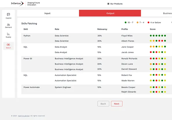 InGenius Match es una plataforma de combinación de habilidades basada en inteligencia artificial que ayuda a las organizaciones a alinear las habilidades de los empleados con las funciones laborales, las necesidades de capacitación y las estrategias de planificación de la fuerza laboral. Elimina los desajustes y mejora la utilización del talento.
